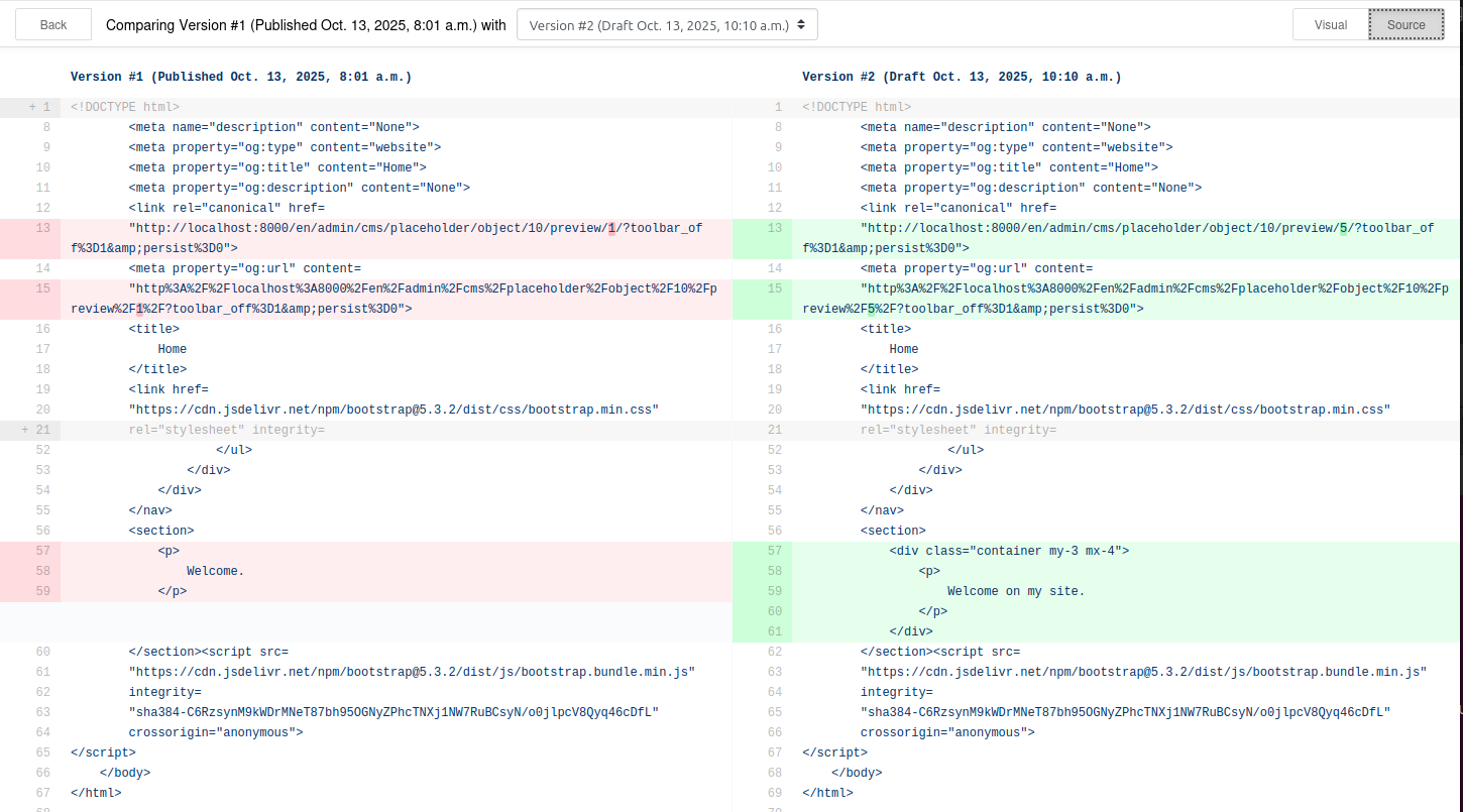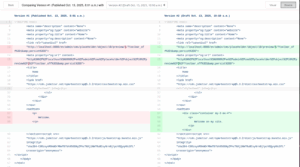 Systém nabízí vizuální porovnání dvou verzí („diff“), kde zeleně zvýrazňuje přidaný obsah a červeně odstraněný obsah.